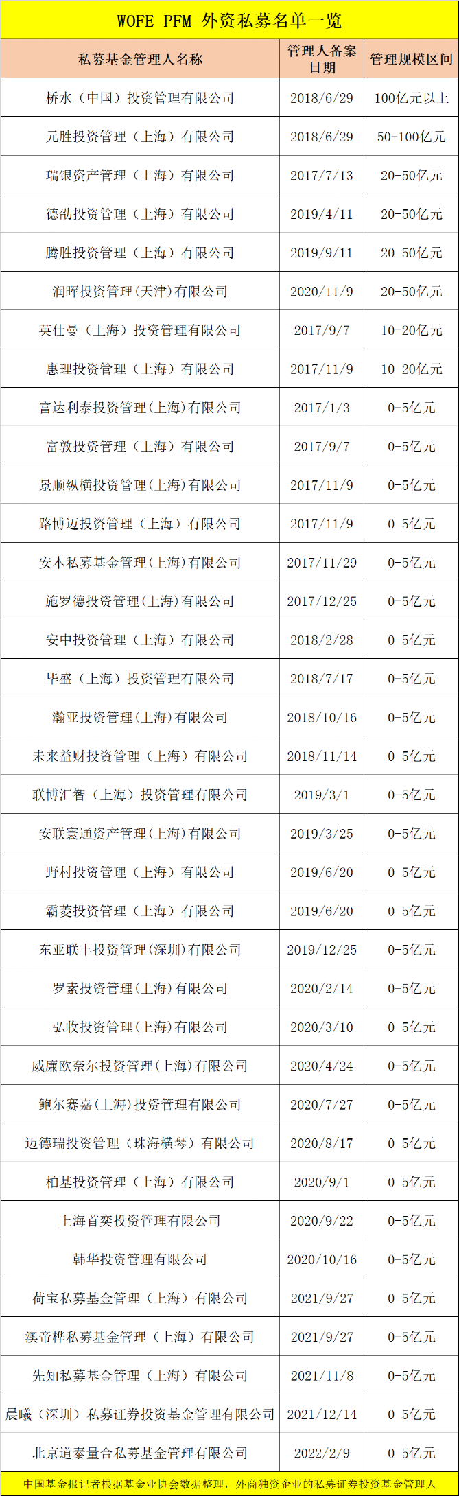 基金业协会信息显示,从2017年1月首家外资私募富达利泰投资完成登记以来,到现在完成备案登记的外商独资私募证券投资基金管理人(WOFE PFM)共有36家,包括最新完成备案的北京道泰量合私募基金管理有限公司、晨曦(深圳)私募证券投资基金管理有限公司、先知私募基金管理(上海)有限公司、澳帝桦私募基金管理(上海)有限公司、荷宝私募基金管理(上海)有限公司等。