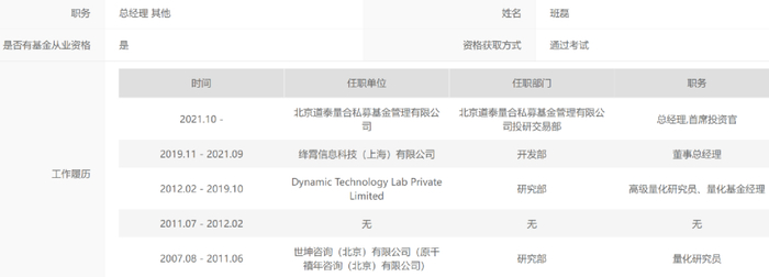 基金业协会网站信息也显示,北京道泰量合私募基金的法定代表人、执行董事是TAN HEAP HO,他具有20多年的量化从业经验,曾担任CooperNeff量化研究员,千禧年投资集团量化基金经理,World Quant LLC高级管理合伙人、联合创始人;2010年9月他成为Dynamic Technology Lab的首席执行官兼首席投资官,2018年8月他担任DTL在上海的研发分部绛霄信息科技(上海)有限公司的总经理,2021年7月成为北京道泰量合私募基金的的执行董事。
