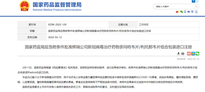 2月11日,药监局根据《药品管理》相关规定,按照国家药品监督管理局特别法程序,进行审查复审,附加条件批准辉瑞公司冠病毒治疗药物奈玛特/利托那韦片组合包装(即Paxlovid)进口注册。