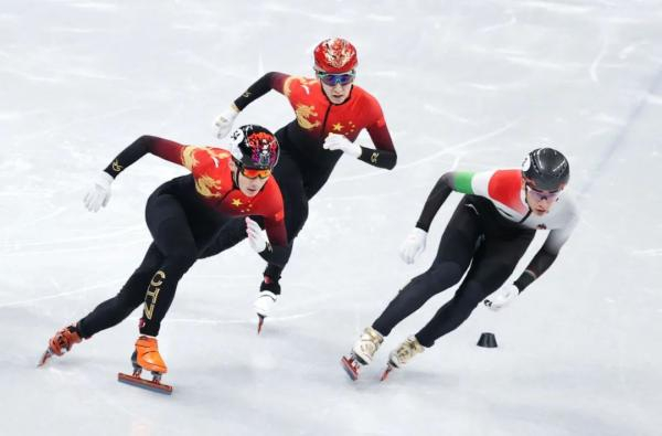 2月7日,任子威(左)与队友武大靖(中)在比赛中。杨磊摄(新华社)