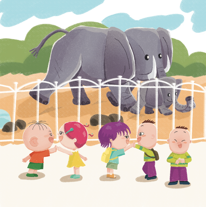 图图他们看到小象和象妈妈甩动长鼻子的可爱模样,忍不住用手指模仿大象的鼻子,你勾我一下,我勾你一下,玩得兴致勃勃。
