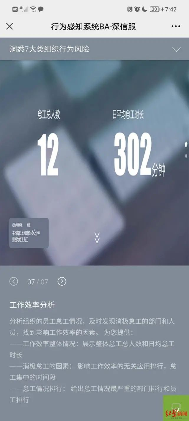 该公司官网显示,行为感知系统还有针对员工上网管控的其他功能,如“工作效率分析”,用以展示工作效率整体情况(整体怠工总人数和日均怠工时长)、消极怠工因素(无关应用排行和怠工集中时间段)和怠工情况排行(给出怠工情况最严重的部门排行和员工排行)。