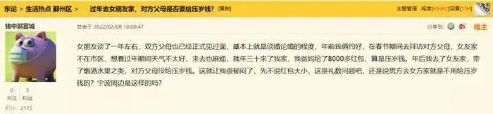网友在宁波东方论坛发帖称,和女友谈了一年左右,双方父母也已经正式见过面,快到谈婚论嫁的程度。年前他们约好,过年期间拜访对方父母。想着女友家不在市区,天气又不是太好,来去也麻烦,除夕就让她到自己家中过年。当时帖主的父母给了她8000元的红包,算是压岁钱。年后,帖主按照约定去了女友家,带了烟酒水果等礼品,但女友的父母没给他红包……