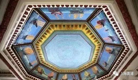底层进入大门是海关大厅,巨大的天然大理石柱上布有贴金花纹,中央大厅八角形穹顶镶嵌八幅彩色马赛克镶拼的帆影海事图案,十分精美。