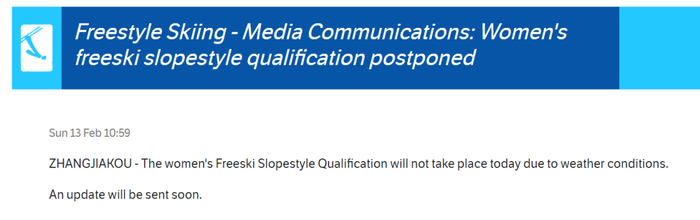 原定于2月13日上午举行的北京冬奥会自由式滑雪坡面障碍技巧资格赛因天气原因改期。