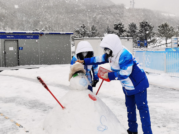 不少志愿者还“忙里偷闲”,堆雪人、打雪仗,享受初雪的美景和快乐。图片来自北京日报客户端