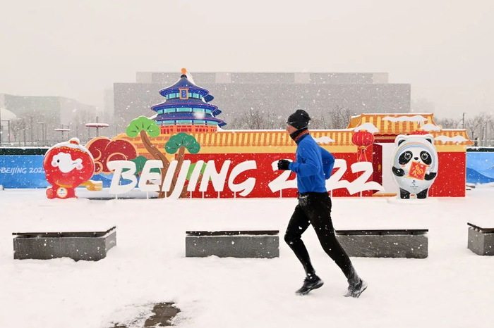 一名男子在北京冬奥会主新闻中心外的区域冒雪跑步(2月13日拍摄)。新华社记者 武巍 摄