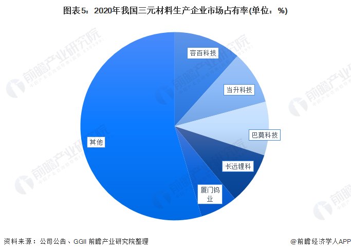 根据高工锂电的数据,2020年我国三元正极材料生产企业TOP5的企业分别为容百科技、当升科技、巴莫科技、长远锂科和厦门钨业,其市场占比分别为11.6%、9.2%、9.2%、9%、6.4%。
