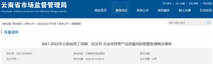 2021-2022年云南省电工用铜、铝及其合金母线等产品质量风险预警监测情况通报