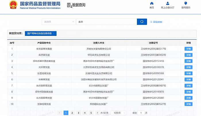 以“生发”为关键词,青眼今日在国家药监局国产特殊化妆品平台上看到共有50条记录(含当前、过期等批件状态),但实际并未直接以“生发”命名,都是育发液产品。另外,在国产药品一栏中搜索,才显示生发搽剂、生发丸、生发片等产品。