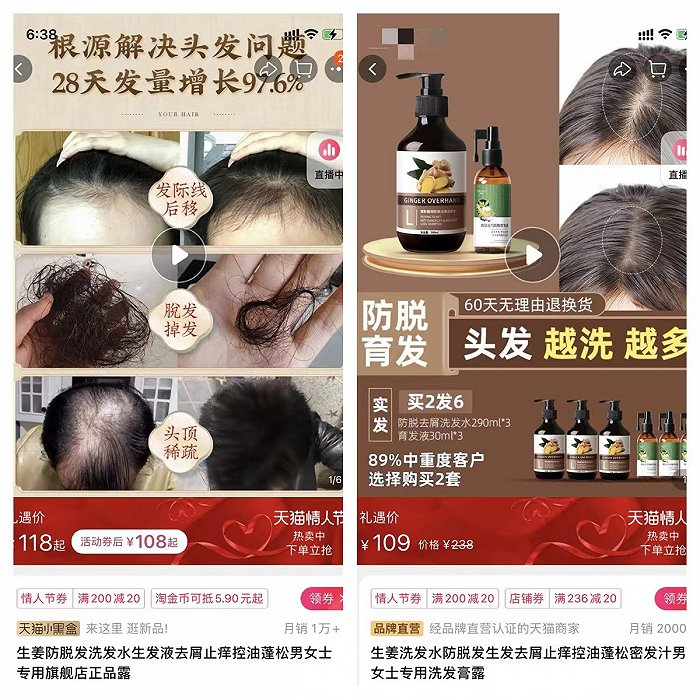 市场的火爆,催生出了大量的“生发”产品。在淘宝、京东、拼多多等各大电商电商平台输入“生发”,可以看到,宣称具有生发功能的国产及进口洗发液产品非常之多,如下图所示的两款产品月销上千上万件。