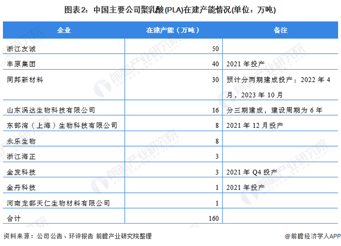 在“白色污染”愈加严重和政策的推动下,国内各企业正在争相进入千亿可降解塑料市场,在建或规划产能达到160万吨。目前,PLA产能正处于快速扩张期,其中浙江友诚在建PLA产能50万吨,项目落户广西崇左,充分利用广西地区丰富的甘蔗渣资源、秸秆纤维资源,后续产业链长、市场前景广,建成投产后对国内聚乳酸产业长远发展具有重要意义。丰原集团在建产能40万吨,预计2021年投产,项目地点在安徽省蚌埠市固镇县经济开发区,是安徽省“增强高质量发展动能暨全省贯彻“六稳”重大项目”之一,聚力推动蚌埠成为全国领先的生物基材料之都、国际化的聚乳酸产业集群。山东同邦新材料在建产能30万吨,预计分两期建成投产,分别为2022年4月和2023年10月,一期工程建成后年产聚乳酸10万吨、聚乳酸纤维5万吨,二期工程建成后全厂年产聚乳酸20万吨、聚乳酸纤维10万吨。山东泓达生物科技有限公司16万吨/年PLA项目分三期建成,建设期为6年。
