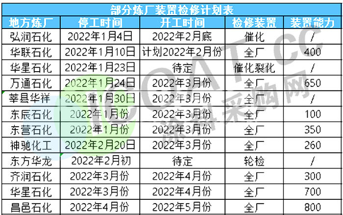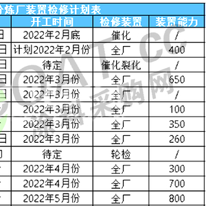 此外,龙润、海特、东辰化工、华联石化等国内多家液化气厂家宣布检修启动,恢复时间待定。东营石化、华联石化等12家炼厂宣布检修时间,涉及产能3560万吨。