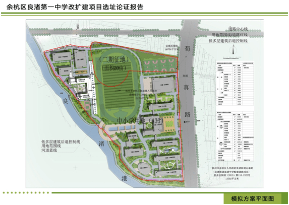 项目位于选址地块位于良渚街道老城区,东至荀真路,南、西至良渚港,北至相邻用地,总用地面积为53333㎡,为良渚一中扩建项目。