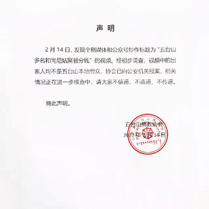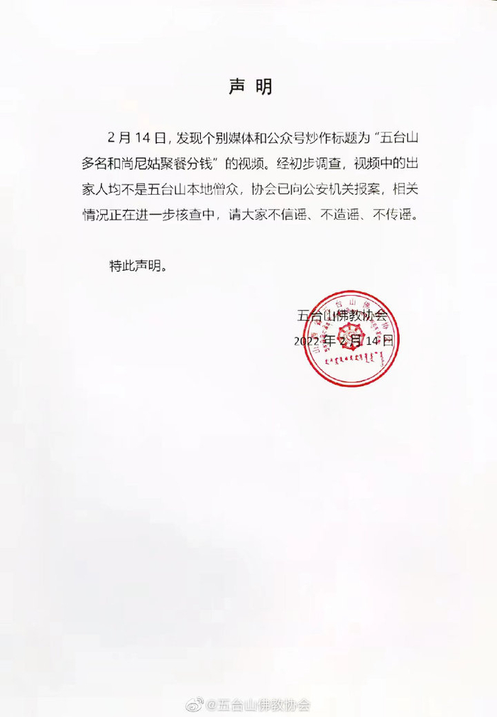 2月14日,五台山佛教协会微博发布声明称,14日发现个别媒体和公众号炒作标题为“五台山多名和尚尼姑聚餐分钱”的视频。经初步调查,视频中的出家人均不是五台山本地僧众,协会已向公安机关报案,相关情况正在进一步核查中,请大家不信谣、不造谣、不传谣。