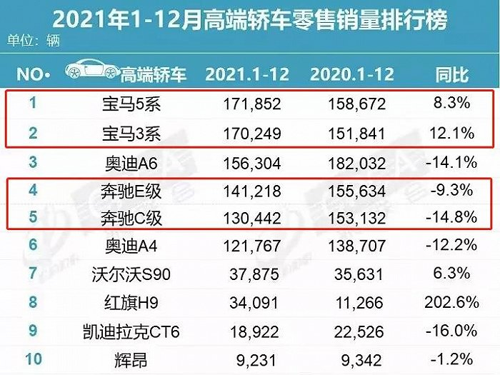 乘联会发布的2021年轿车零售销量排行榜,奔驰没有一款车上榜,但宝马5系和宝马3系榜上有名。在SUV榜上,宝马X3上榜,奔驰未上榜。在高端轿车销量榜中,宝马5系和宝马3系分列第一、第二,奔驰E级和奔驰C级位列第四、第五。