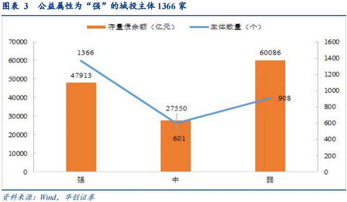 1、公益属性为“强”的城投主体共1366家。城投公司主营业务的公益属性的程度决定了获得支持的力度,在具体的信用研判过程中应作为重点考量的要素之一。我们将3131家城投主体按照公益属性的强度分为了强、中、弱三档。其中对于政府性收入或者政府性投资支出占比超过65%的标的,一般归类为强。