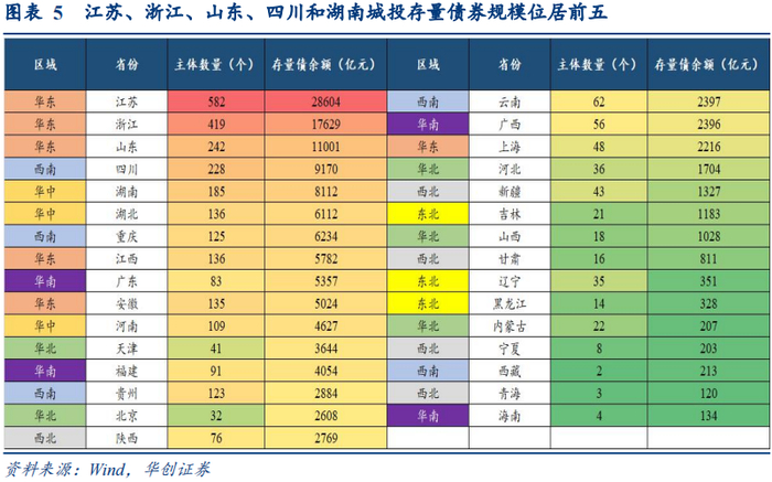 3、区域分布方面,华东、华中、西南及华南区域城投存量债券规模相对较大,而西北及东三省存量债券规模较小。江苏、浙江、山东、四川和湖南城投存量债券规模位居前五。
