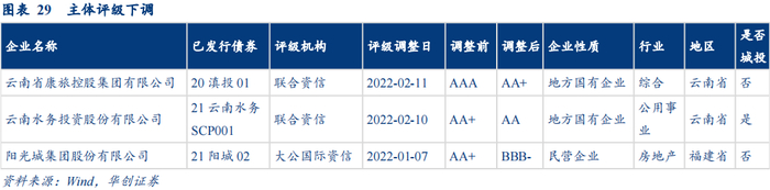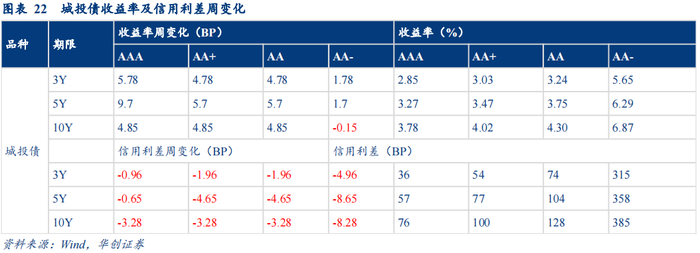 二级市场方面,本周债市成交活跃度较上周下降。银行间市场成交额降至5565亿元,交易所市场成交额下降至117亿元。收益率方面,中短票收益率普遍上行,长期限信用利差收窄;城投债收益率普遍上行,信用利差全面收窄。评级调整方面,评级下调的主体有3家,分别为云南省康旅控股集团有限公司、云南水务投资股份有限公司、阳光城集团股份有限公司。无评级上调的主体。