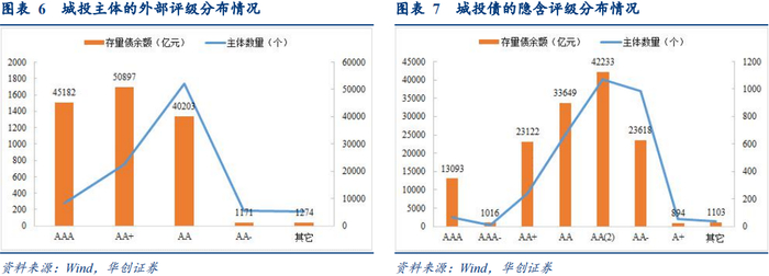 4、级别的分布方面,外部评级来看,AA级别主体数量达到1733家,占总数量的55.35%,而高等级和低等级主体数量相对少;从存量债余额的分布上看,AA+级别的主体存量债券合计余额最高,为50897亿元。隐含评级来看,无论是从主体数量还是存量债券方面来看,AA(2)等级的城投债规模均为最高。