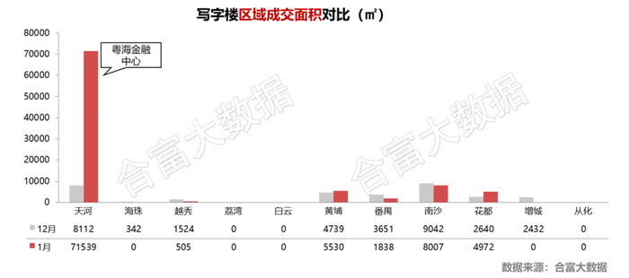 合富大数据显示,1月全市写字楼成交量为92391㎡,同比上升75%,环比12月升184%;由于粤海金融中心整栋交易,往年一般较淡静的1月份今年收获偏高的成交量。
