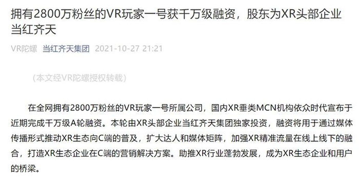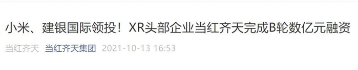 此外,国内XR垂类MCN机构依众时代宣布,近期完成千万级A轮融资,由当红齐天独家投资,融资将用于通过媒体传播形式推动XR生态向C端的普及,扩大达人和媒体矩阵,加强XR精准流量在线上线下的融合,打造XR生态企业在C端的营销解决方案。
