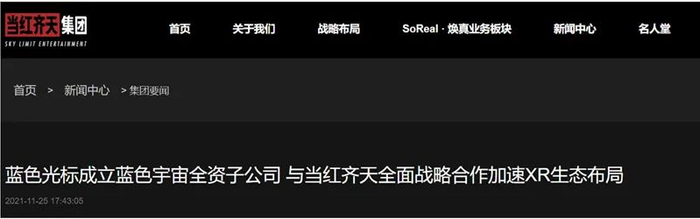 2021年11月25日,当红齐天公司官网显示,近日,蓝色光标与当红齐天及旗下子公司齐乐无穷签署战略合作协议,双方将联合推动XR体验在重点行业的应用拓展及商业化项目落地。