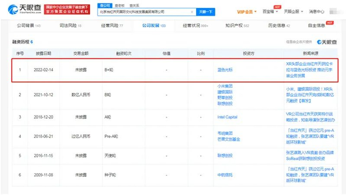天眼查显示,近日,XR头部企业北京当红齐天国际文化科技发展集团有限公司(下称“当红齐天”)宣布完成B+轮融资,投资方包括拉卡拉,以及蓝色光标作为基石投资人发起设立的蓝图海兴基金。
