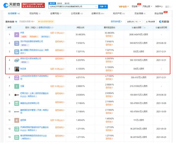 当红齐天成立于2008年2月,法定代表人为齐笑,注册资本约7575万元,经营范围包括:承办展览展示活动、影视策划、企业策划等,股东信息包含张艺谋、英特尔亚太研发有限公司、小米关联公司瀚星创业投资有限公司等。