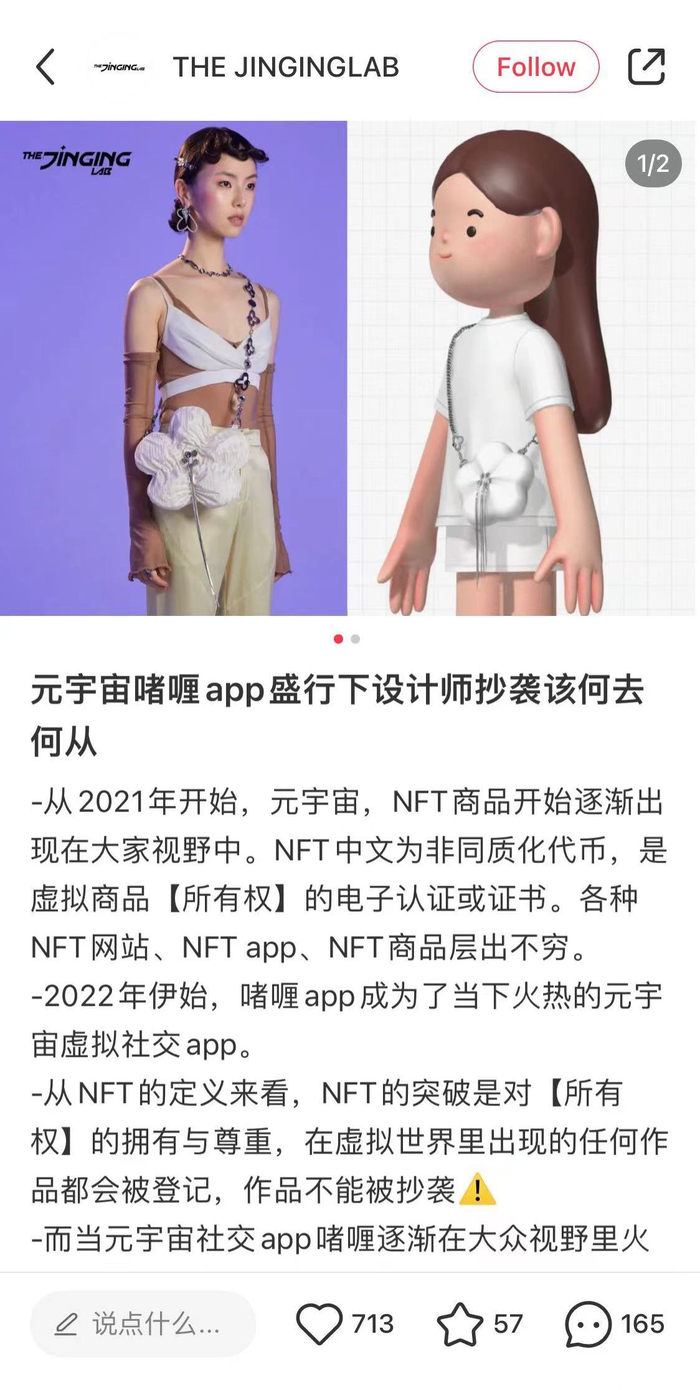 进行数字化转型已经成为品牌共识,但仍多集中于营销领域。此前界面时尚写过,虚拟产权保护在现阶段仍处于模糊地带。虚拟世界领域去中心化的属性意味着任何人都能上传和销售产品,成为版权拥有者。尽管古驰和路易威登等品牌已经着手对虚拟产权进行保护,但大量侵权行为实则早已发生。