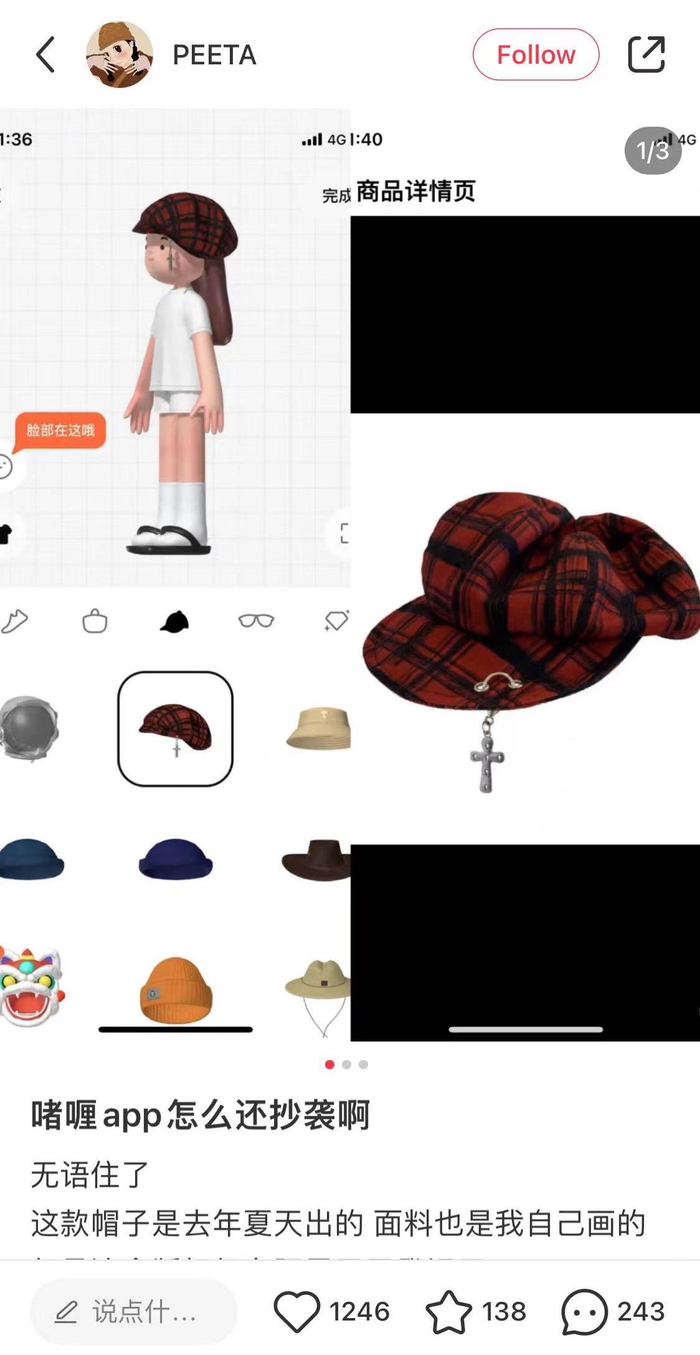 小红书用户PEETA称啫喱的帽子与其设计相似