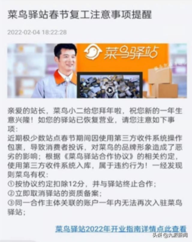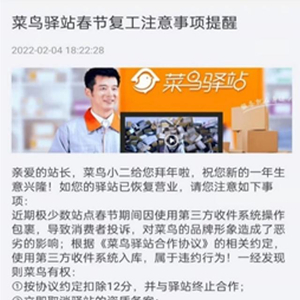 近期,节后返工,菜鸟驿站发布的一则《春节复工注意事项提醒》“提醒”了整个快递行业。这份被不少行业人士喻为“最后通牒”的“提醒”指出,根据《菜鸟驿站合作协议》的相关约定,使用第三方收件系统入库,属于违约行为。一经发现则菜鸟有权与驿站终止合作,且同一合作主体关联的账户一年内无法再次入驻菜鸟驿站。