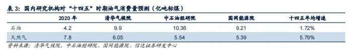 我们对比清华气候院、中石油经研院、国网能源研究院对“十四五”期间石油、天然气消费量的预测后,选取中性偏乐观的中石油经研院预测数据,预计到“十四五末,石油消费量为10.4亿吨标煤,天然气需求为5.5亿吨标煤;”“十四五”期间石油消费年均增速为1.72%,天然气消费年均增速为5.79%