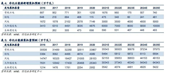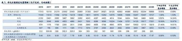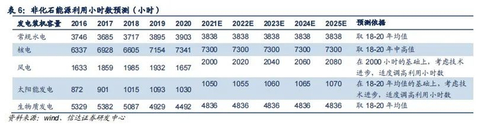对非化石能源的利用小时数,水电我们取近三年均值,预计年均为3838小时;核电我们取近三年中高值,预计年均为7300小时;风电和光伏我们在近三年均值基础上,考虑技术进步,适度调高利用小时数;生物质发电取近三年均值,预计为4856小时。