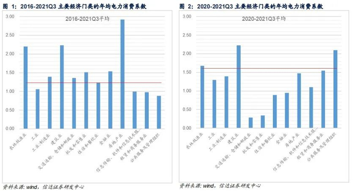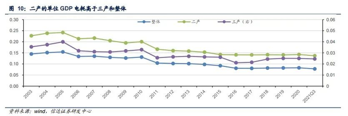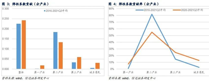 分产业看,在2016-2021Q3年均提升0.226中,一产、二产、三产、城乡居民分别贡献0.002、0.184、0.033、0.006,贡献度分别为1.03%、81.69%、14.81%、2.47%;2020-2021Q3年均提升的0.243中,一产、二产、三产、城乡居民分别贡献0.018、0.133、0.060、0.031,贡献度分别为7.59%、54.90%、24.65%、12.86%;由此可见,在近两年整体电力消费弹性系数加快的进程中,二产的贡献度明显回落,降26.79个pct;而一产、三产以及城乡居民用电明显提升,贡献度分别提升6.56、9.84、10.39个pct。