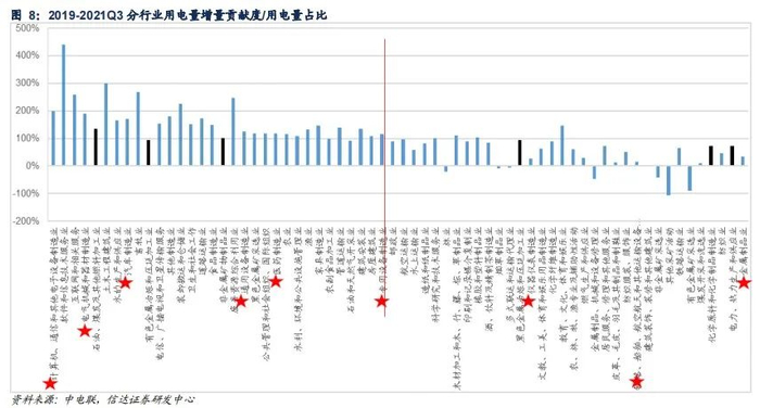 此外,在国民经济分类中比“门类”颗粒度更细一层为“大类”,我们用66个大类的用电量数据来分析,2019-2021Q3近三年年均各大类对全社会用电量的边际贡献情况(用电量增量贡献度-用电量占比)。传统六大(4+2)高耗能产业(黑色、有色、化工、建材、燃料加工、电力热力生产)累计边际贡献 -2.7%;而高技术与装备制造业(汽车制造业、计算机/通讯和其他电子设备制造业、医药制造业、金属制品业、通用设备制造业、专用设备制造业、电气机械和器材制造业、仪器仪表制造业、铁路/船舶/航空航天和其他运输设备制造业9个行业)累计边际贡献为1.13%,且有6个行对全社会用电量增长是正拉动。