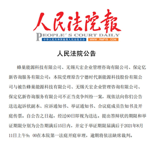 蜂巢能源方面向本报记者表示:“我们已经关注到媒体的报道,公司一直合法、合规经营。我们相关部门正在积极准备开庭应诉,相信法律会有公正的判决。”对于案件的更多信息,蜂巢能源方面未进一步透露。