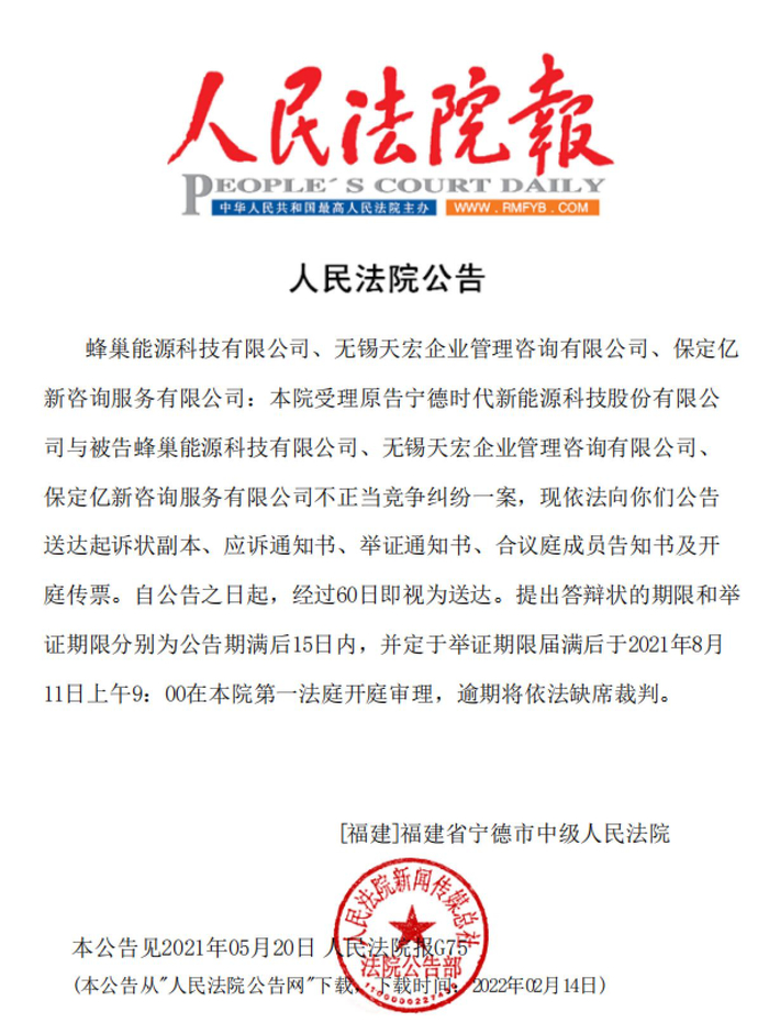人民法院公告网披露的文件显示,宁德时代早在2021年5月就起诉了蜂巢能源、保定亿新、无锡天宏。