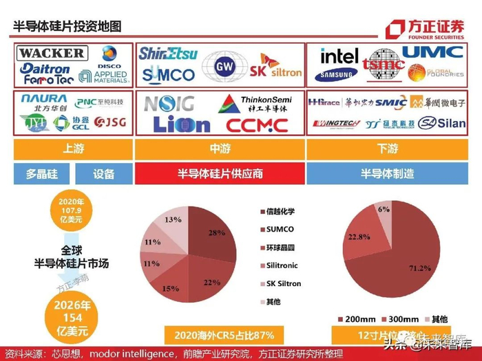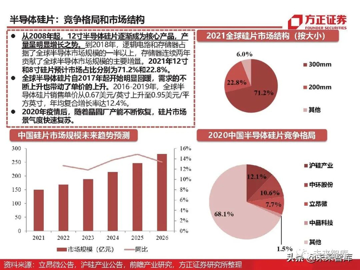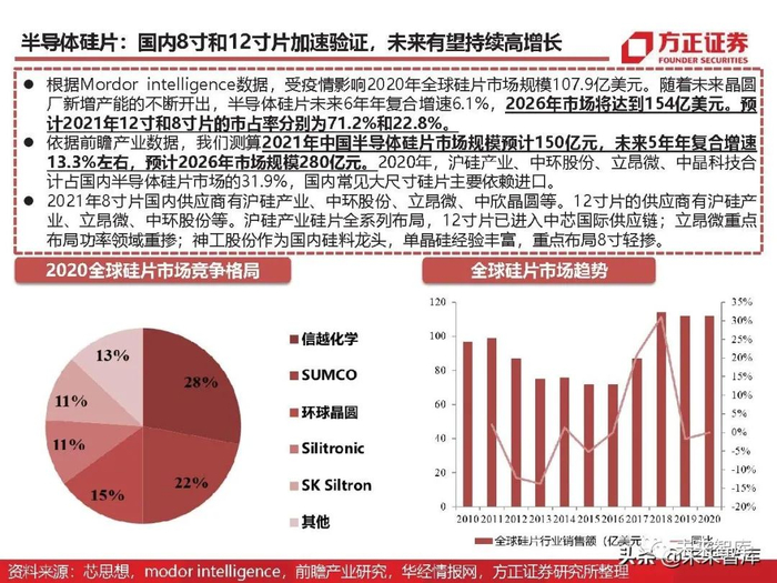 根据Mordor intelligence数据,受疫情影响2020年全球硅片市场规模107.9亿美元。随着未来晶圆 厂新增产能的不断开出,半导体硅片未来6年年复合增速6.1%,2026年市场将达到154亿美元。预 计2021年12寸和8寸片的市占率分别为71.2%和22.8%。