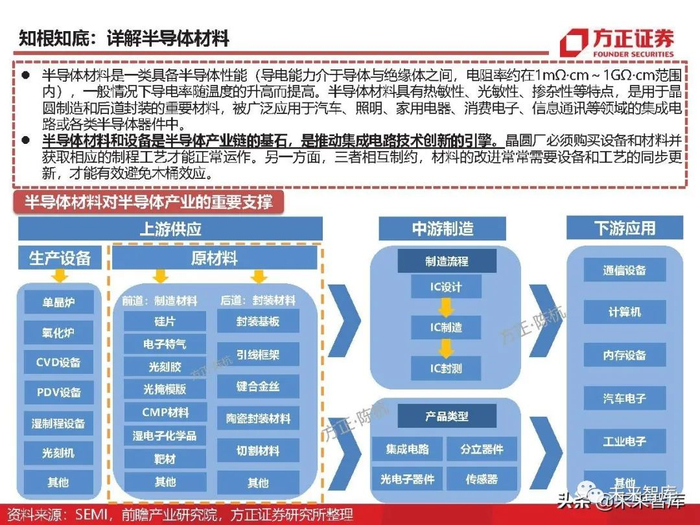 半导体材料是一类具备半导体性能(导电能力介于导体与绝缘体之间,电阻率约在1mΩ·cm~1GΩ·cm范围 内),一般情况下导电率随温度的升高而提高。半导体材料具有热敏性、光敏性、掺杂性等特点,是用于晶 圆制造和后道封装的重要材料,被广泛应用于汽车、照明、家用电器、消费电子、信息通讯等领域的集成电 路或各类半导体器件中。