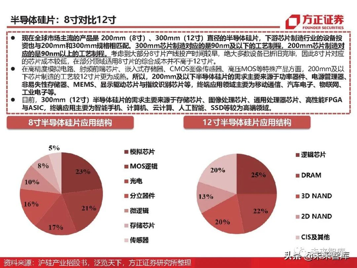 8寸对比12寸:现在全球市场主流的产品是 200mm(8寸)、300mm(12寸)直径的半导体硅片,下游芯片制造行业的设备投 资也与200mm和300mm规格相匹配。300mm芯片制造对应的是90nm及以下的工艺制程,200mm芯片制造对 应的是90nm以上的工艺制程。考虑到大部分8寸片产线投产时间较早,绝大多数设备已折旧完毕,因此8寸片对应 的芯片成本较低,在部分领域适用8寸片的综合成本并不高于12寸片。