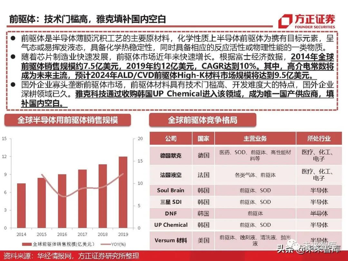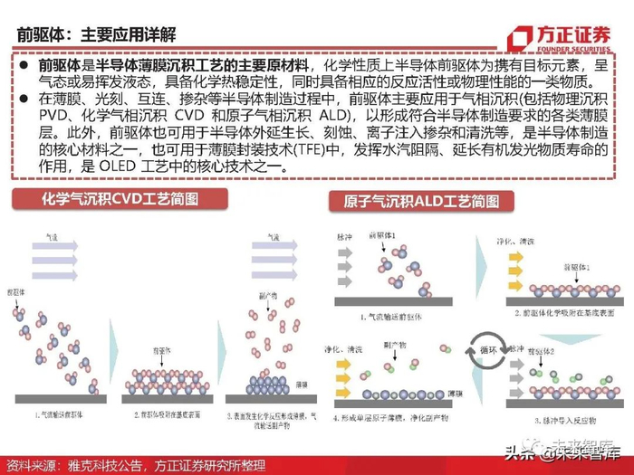 前驱体是半导体薄膜沉积工艺的主要原材料,化学性质上半导体前驱体为携有目标元素,呈 气态或易挥发液态,具备化学热稳定性,同时具备相应的反应活性或物理性能的一类物质。