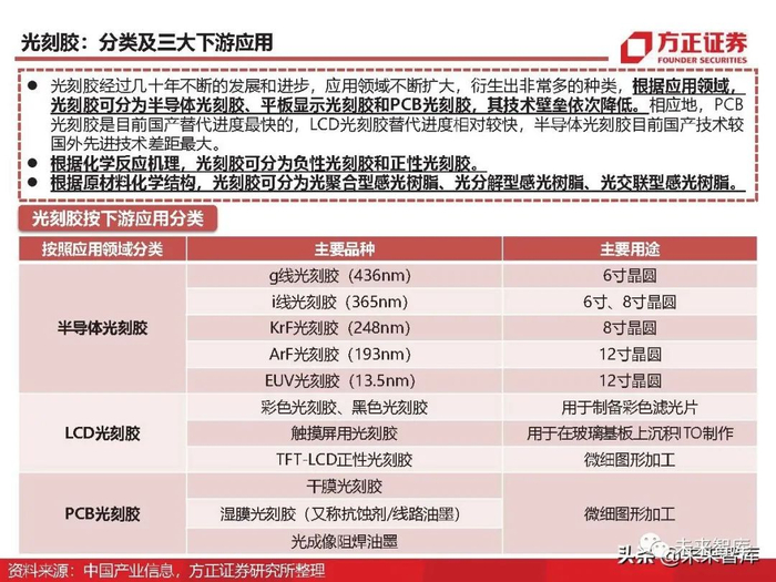 分类及三大下游应用:光刻胶经过几十年不断的发展和进步,应用领域不断扩大,衍生出非常多的种类,根据应用领域, 光刻胶可分为半导体光刻胶、平板显示光刻胶和PCB光刻胶,其技术壁垒依次降低。相应地,PCB 光刻胶是目前国产替代进度最快的,LCD光刻胶替代进度相对较快,半导体光刻胶目前国产技术较 国外先进技术差距最大。