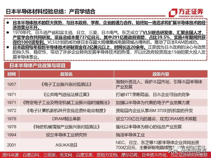 1970年代,日本通产省和富士通、日立、三菱、日本电气、东芝成立了VLSI联合研发体,汇聚全国人才, 产官学合作共同研发。项目总成本是737亿日元,其中291亿是政府资助,占比39.5%,实施4年期间共获 得约1000项专利。VLSI计划的成功使日本在超大规模集成电路领域占得先机,推动了日本RAM的成功。