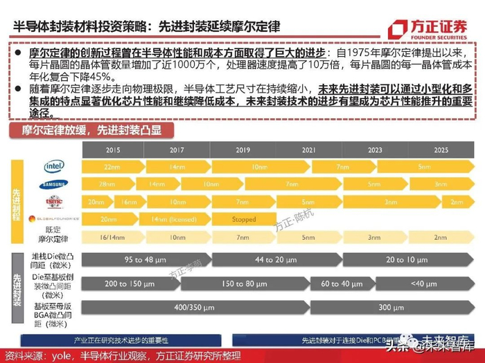 先进封装延续摩尔定律:摩尔定律的创新过程曾在半导体性能和成本方面取得了巨大的进步:自1975年摩尔定律提出以来, 每片晶圆的晶体管数量增加了近1000万个,处理器速度提高了10万倍,每片晶圆的每一晶体管成本 年化复合下降45%。