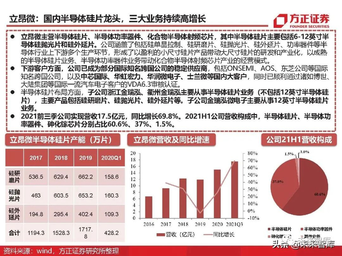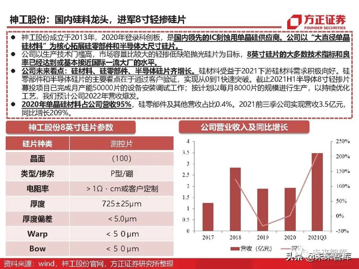 我们认为半导体的景气周期存在“设备先行,制造接力,材料缺货”的普遍规律。考虑到国内晶圆厂已经进 入扩产环节,而且新增产能将于2022年陆续开出。晶圆产能扩充会直接导致上游材料端出现了供不应求的 情况,从而形成周期性的“硅片危机”。全球硅片大厂信越化学已经发布涨价声明,称在2021年4月对部分 硅片产品提价。同时,沪硅产业董秘李炜在SEMICON CHINA 2021会议上曾表示目前有部分品类涨价,并 非全部,而公司硅片的订单已经超过了供给能力。