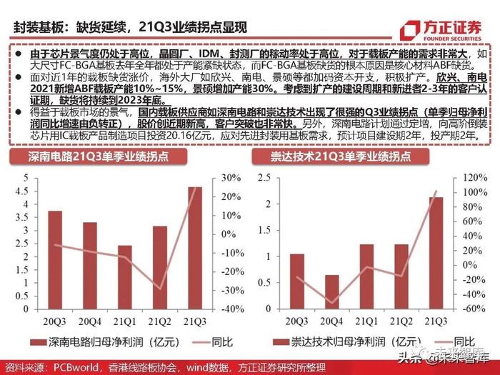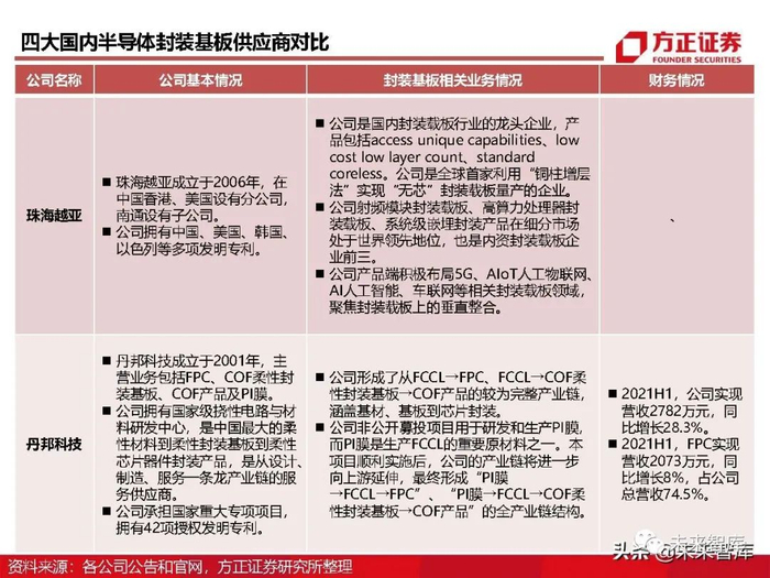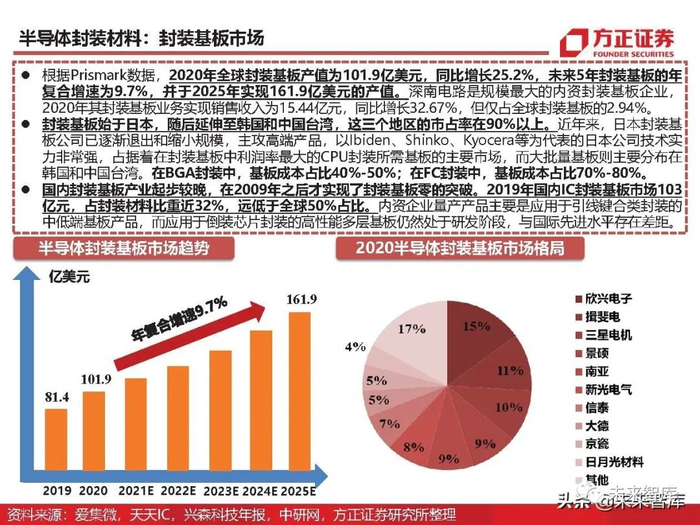 根据Prismark数据,2020年全球封装基板产值为101.9亿美元,同比增长25.2%,未来5年封装基板的年 复合增速为9.7%,并于2025年实现161.9亿美元的产值。深南电路是规模最大的内资封装基板企业, 2020年其封装基板业务实现销售收入为15.44亿元,同比增长32.67%,但仅占全球封装基板的2.94%。