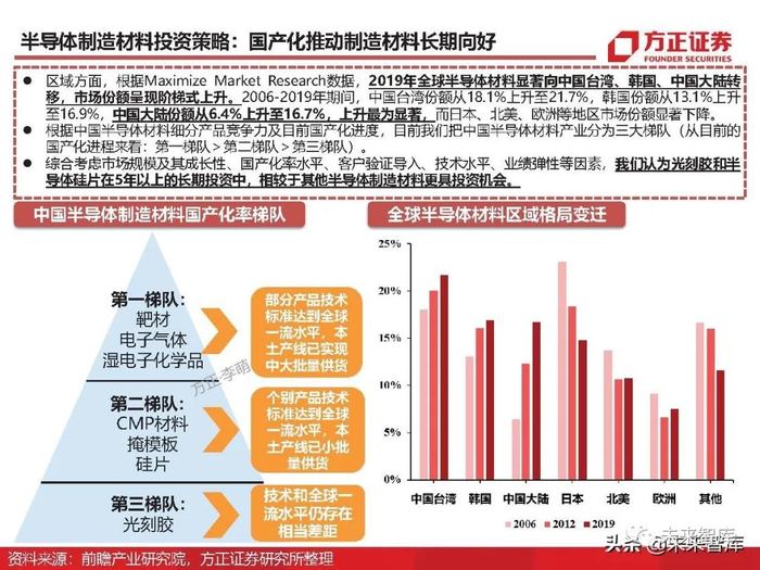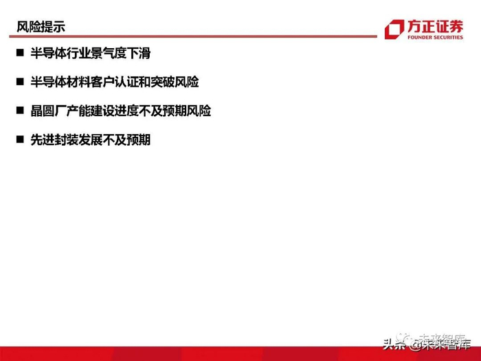 我们认为,在中期维度方面,封装材料基于更高的国产化率,能够更早地实现国产替代。同时,国 内封测全球领先,定增扩产明显,下游驱动更为直接。在长期维度方面,半导体制造材料相较于封 装材料拥有更高的壁垒和国产化潜力,所以制造材料的长期成长空间更大。