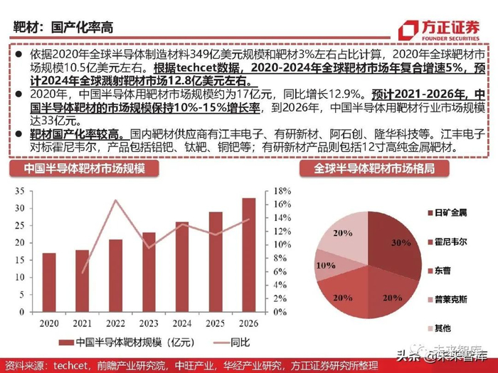 依据2020年全球半导体制造材料349亿美元规模和靶材3%左右占比计算,2020年全球靶材市 场规模10.5亿美元左右。根据techcet数据,2020-2024年全球靶材市场年复合增速5%,预 计2024年全球溅射靶材市场12.8亿美元左右。