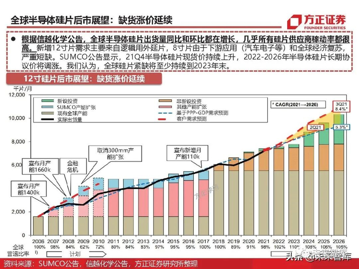 根据信越化学公告,全球半导体硅片出货量同比和环比都在增长,几乎所有硅片供应商稼动率都很 高。新增12寸片需求主要来自逻辑用外延片,8寸片由于下游应用(汽车电子等)和全球经济复苏, 严重短缺。SUMCO公告显示,21Q4半导体硅片现货价持续上升,2022-2026年半导体硅片长期协 议价将调涨。我们认为,全球硅片紧缺将至少持续到2023年末。